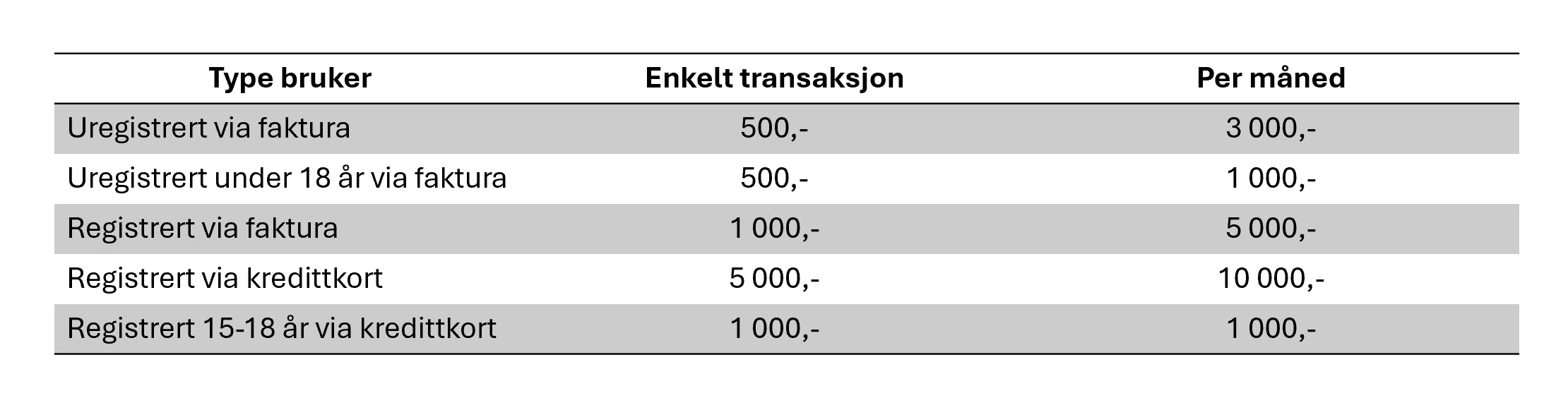Tabellen under viser grensene for betaling med strex. Grensene er avhengig av om bruker er registrert hos strex samt brukers alder, og om man har lagt inn betalingskort hos strex. Registrer deg hos strex, så får du høyere grense.